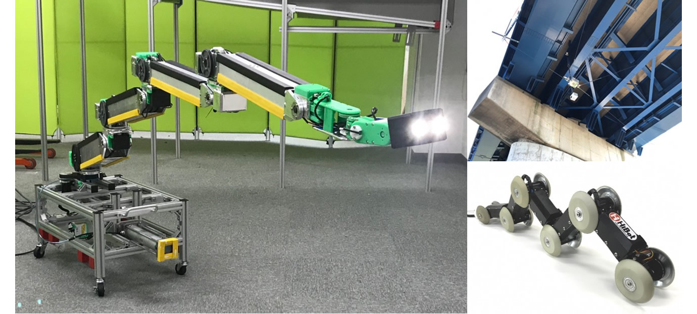 蛇型マニピュレータロボットは化学・石油プラントや航空機の燃料タンク内など狭隘な空間での点検作業でのニーズが見込まれ、今後は①リンク4本まで連結しての動作確認と、②動きの制御とパス・プラニングのソフトウェアーの開発を行うとともに、小型化と軽量化を目指しています。