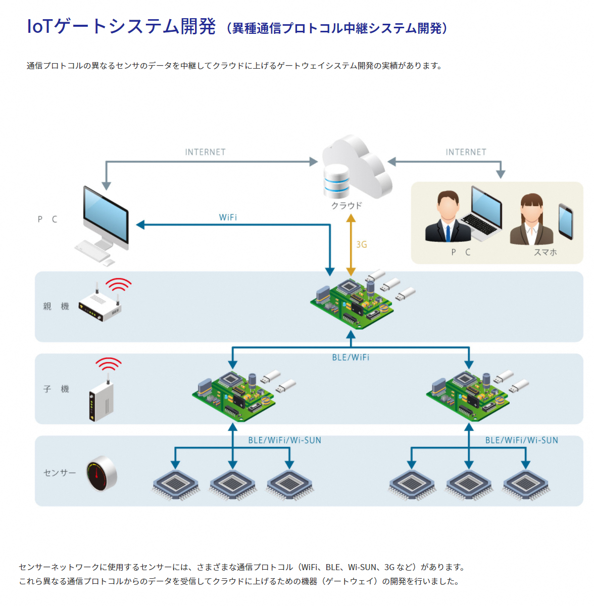 センサーネットワークに使用されているセンサーは目的・機能・性能を含め多種多様であり、さまざまな通信プロトコル(Wi-Fi、BLE、Wi-SUN、3G など)で利用されています。当社では各種センサーからの異なる通信プロトコルで送信されたセンサーのデータを受信してクラウドに上げるためのIoTゲートシステム(異種通信プロトコル中継システム)の開発実績があります。