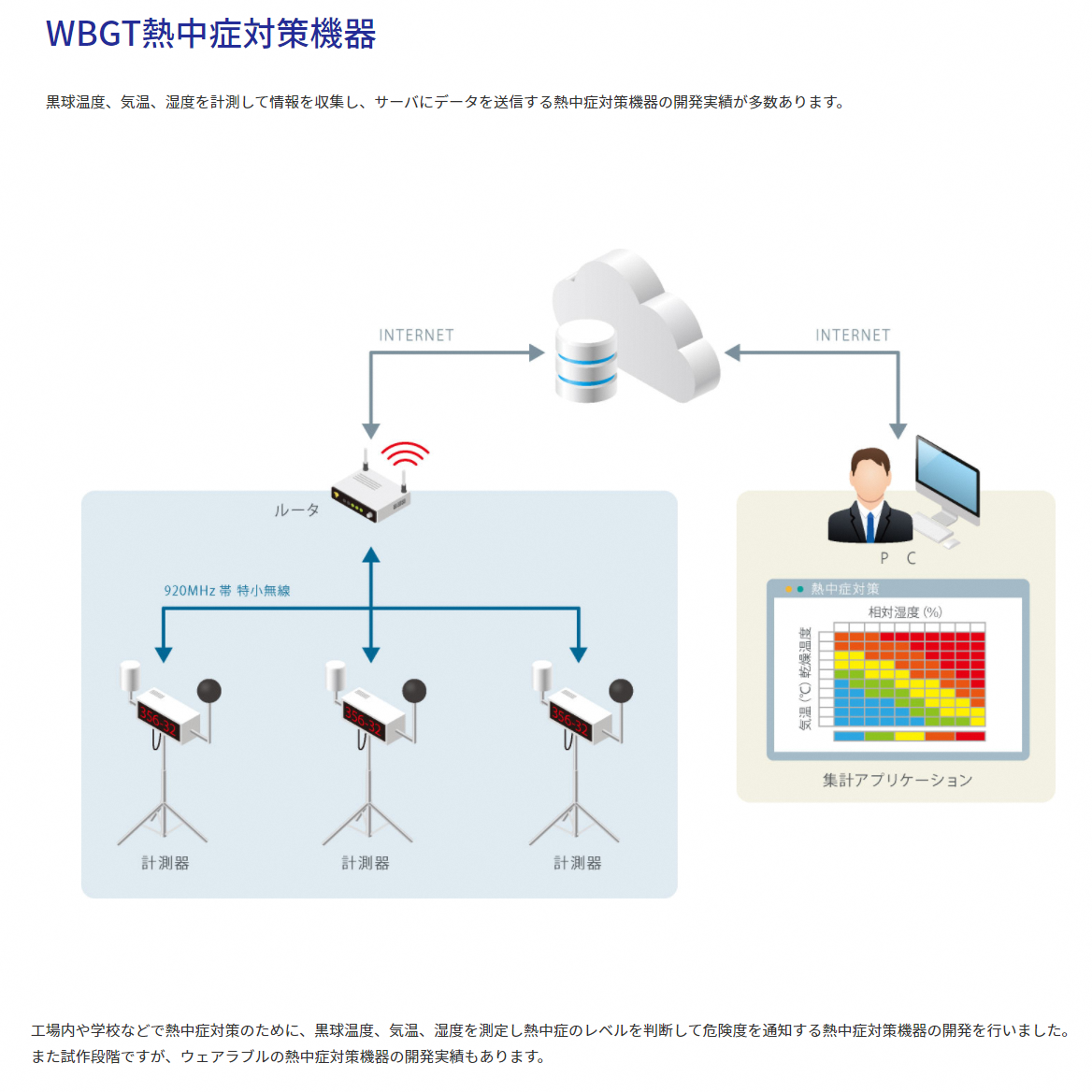 センサーユニットにより黒球温度・気温・湿度を計測・収集し、サーバーにデータを送信する熱中症対策機器により、『WBGT(暑さ指数)』を見える化し、学校・介護施設・建設現場・工場など屋内外の熱中症予防に貢献します。
