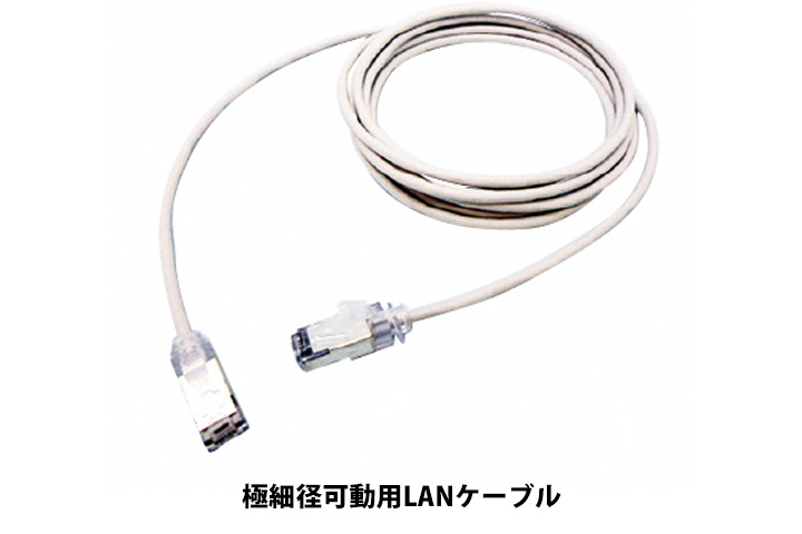 繰り返し曲げが可能な柔軟性あるLANケーブルです。指定長にてRJ45モジュラージャックプラグ付きで提供いたします。外径4mmで重量は25g/mと2重シールド付き4対8芯ケーブルとしては世界最小径です。外被はFA用途を考慮し、耐油性、耐熱性、難燃性、柔軟性に優れた非鉛PVCを使用しています。