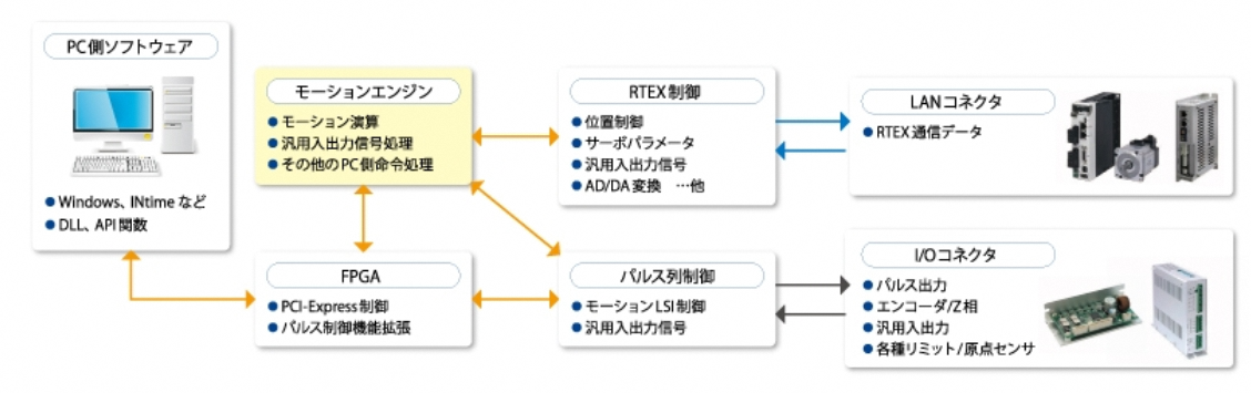 当社の多機能モーションコントローラは、サーボ用高速ネットワーク「Realtime Express(RTEX)」や、産業用イーサネット「EtherCAT」を備えたPCI-Express用の独自ボードです。直接入出力や高速通信機能と合わせて演算のためのモーションエンジンを搭載しており、ボード自体でPCやOSに依存しない高速なモータ制御が実現できます。