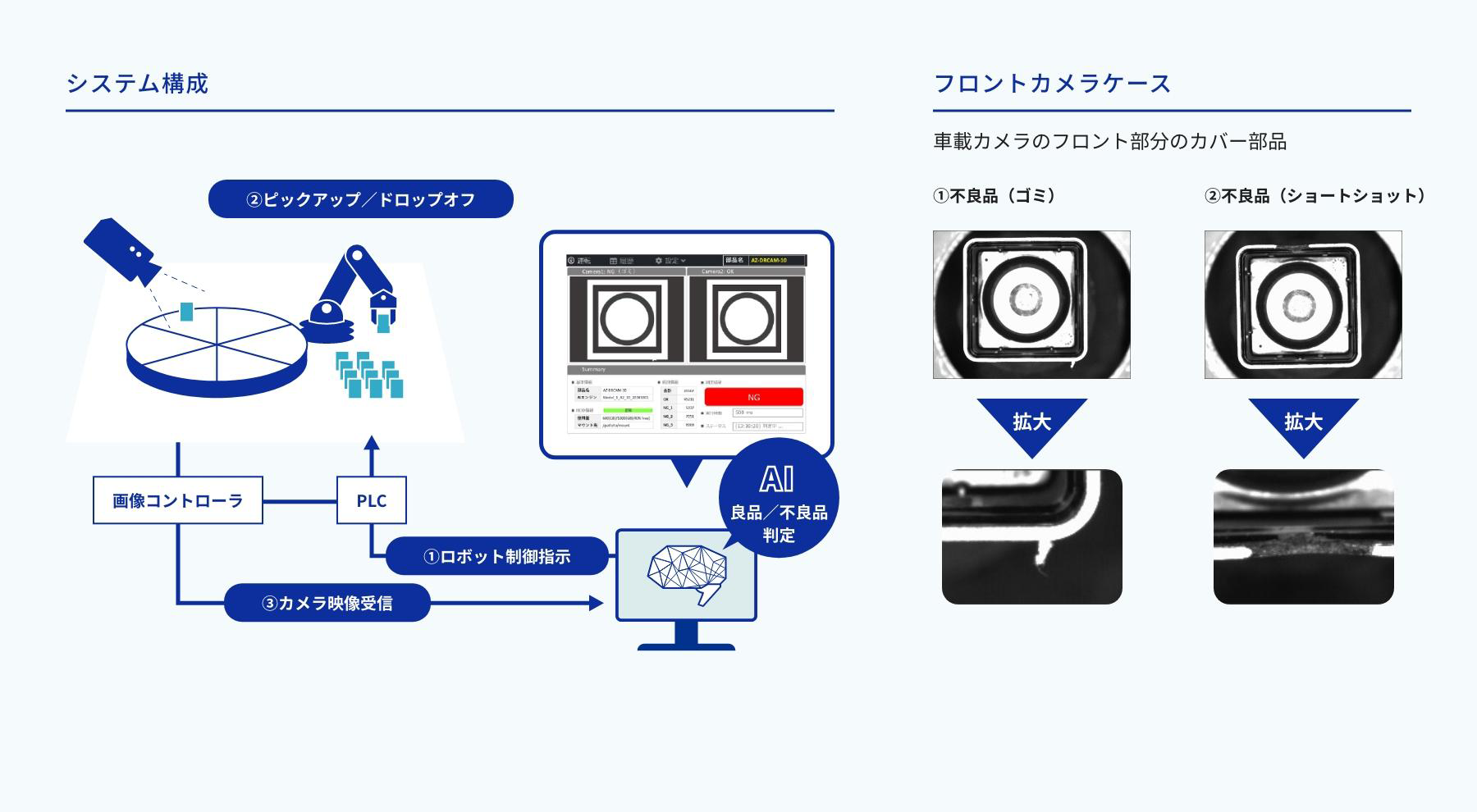 自動検査システムは画像認識AIシステムと組み合わせるPLC(Programmable Logic Controller)連携サブシステムという外部連携インターフェースが実装されています。