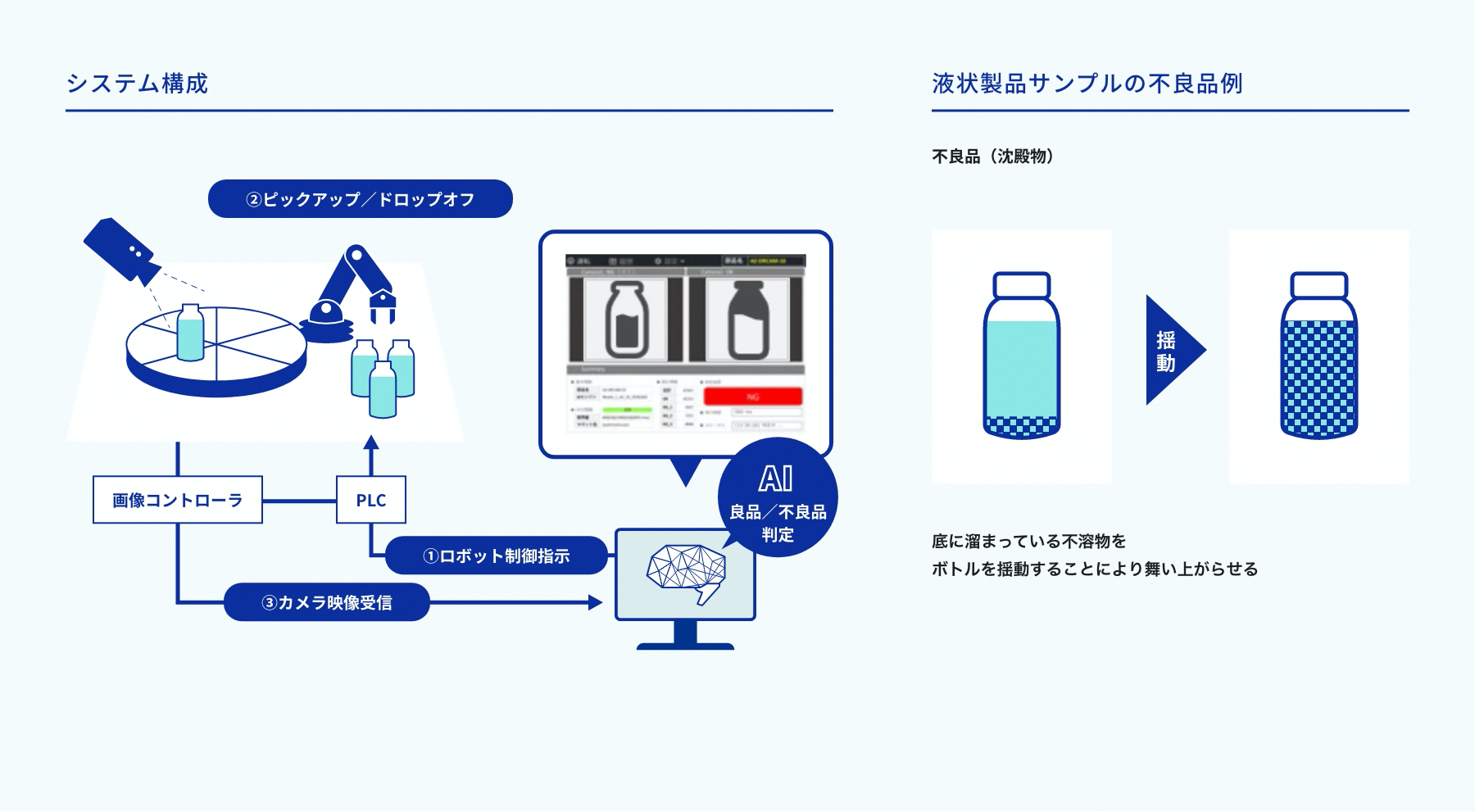 液体製品のボトルを揺動させ、その状態をカメラで連射撮影。沈殿物や異物の有無をAIによって判定するシステムです。高精度AIによりスピーディーに液体不純物の自動検出を実現できます。