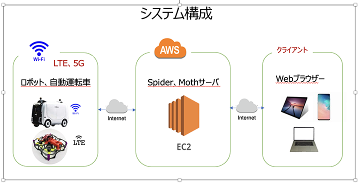 弊社通信サーバーのMOTH、SPIDERはクラウド環境、お客様独自環境に構築し、ロボット、重機などのリアルタイムでの遠隔操作を可能にします。