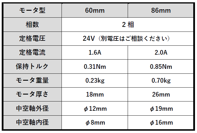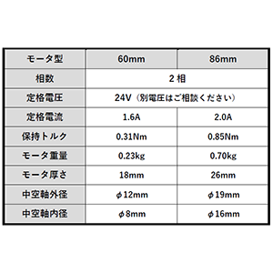 モータは60mm角、86mm角で、厚さは18mm、26mmと小型薄型でありながら、0.31Nm、0.876Nmの高い保持トルクと、同等サイズで業界トップクラスの高い回転トルクを実現しています。