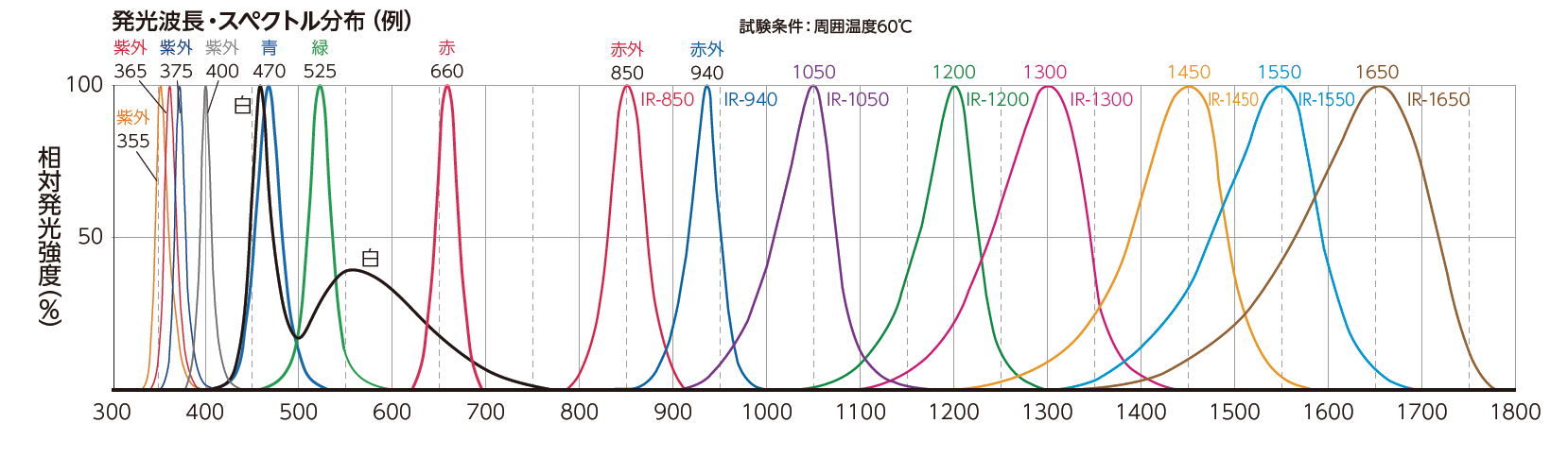● 豊富な発光色:近紫外光、白赤青緑などの可視光、近赤外光、高演色光など全17種類の発光色・発光波長を標準で用意しています。