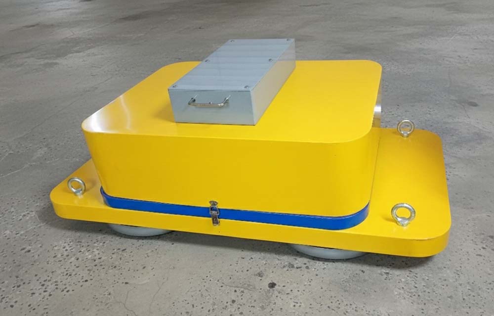 複雑な操舵機構を排除し、モーター制御のみで移動するため、圧倒的な「軽量化」と「メンテナンス性の向上」を達成しました。低出力モーターでも効率よく稼働し、バッテリーによる長時間運転が可能です。操作はジョイスティック1本で完結。ゲーム感覚の直感的な操作で、経験の浅い作業員でも即座に熟練工のような動きを再現できます。 千円札の上に載っているのが操縦機でジョイスティックで誰でも操縦できます。