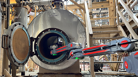 ・アームの先端に超音波センサ、ガスセンサやカメラを取り付け、設備の肉厚測定や目視点検のデータを取得するとともに、搭載されているライダー(レーザー光を使ったセンサ)を用いて設備を仮想的に映し出すことにより、コンピュータの画面上で、設備点検が可能となります。また、点検内容によってアーム先端のツールを交換ができるため、お客様の点検ニーズに沿った様々なデバイスを装着できるような設計を実現しています。