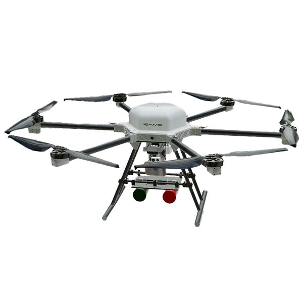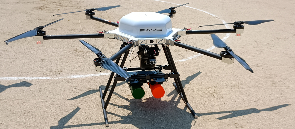 平時は鳥獣害対策、海・山での遭難者探索、有事は災害時の被災者探索を行う機能を有しているドローンです。 探索用サーモグラフィ付きカメラ、防災アナウンス用「スピーカー」、衛星電話などの物資機能を搭載しています。 上空カメラ映像をクリックすると地図上に測位するガーディアン機能を搭載しています。