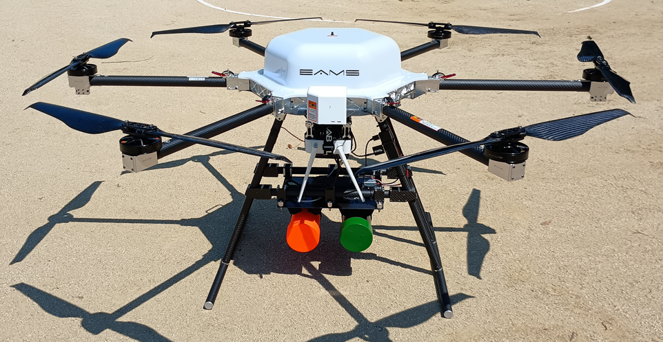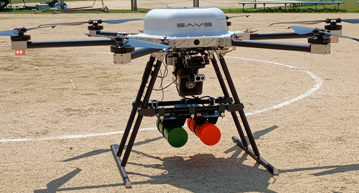 企業・製品URL:https://www.eams-robo.co.jp/「レスキューK」はイームズロボティクスが実際の災害現場における救援活動で得た経験を反映させた「災害対策ドローン」です。 平時は鳥獣害対策、海・山での遭難者探索、有事は災害時の被災者探索を行うというコンセプトで開発されました。 「探索用サーモグラフィ付きカメラ」「防災アナウンス用スピーカー」「衛星電話などの物資投下機能」を搭載しています。 また、上空カメラ映像をクリックすると地図上に測位するガーディアン機能を搭載しています。
